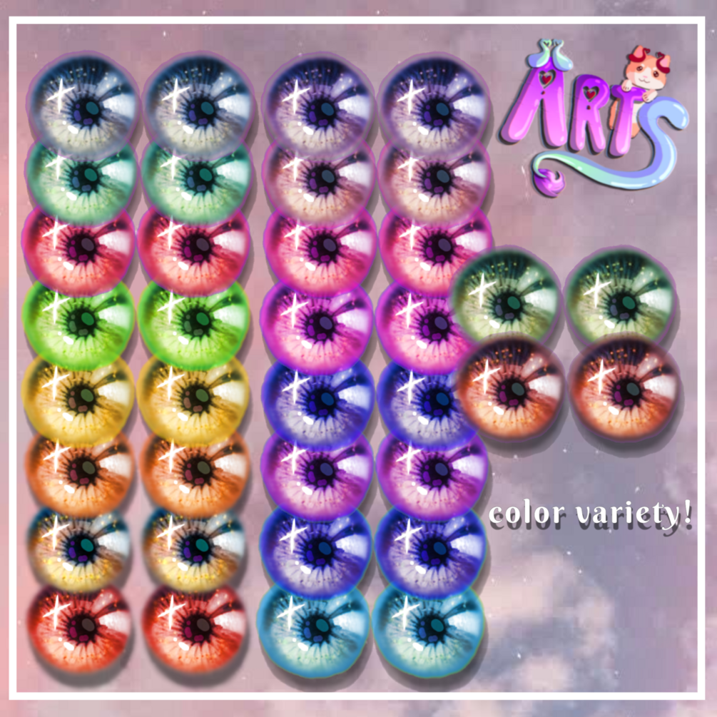 You get a transparent PNGs of the eye textures, there over 19 eye textures of a variety of colors! Fun to mix and match with and can be easily edited onto any head base!
